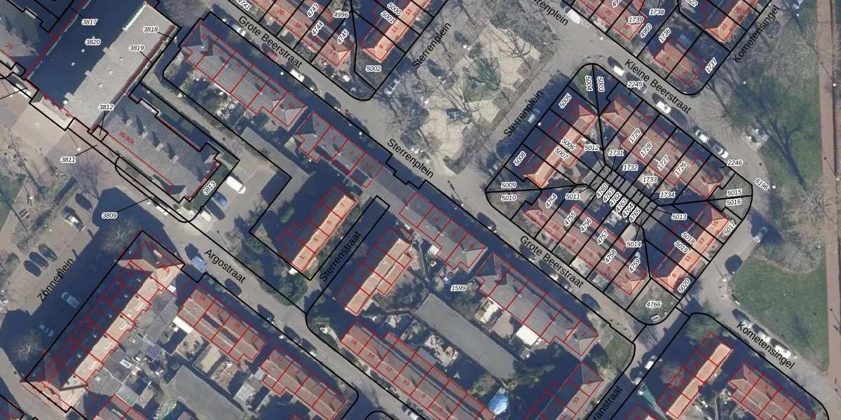 Het perceel waarop Sterrenplein 2 staat heeft een oppervlakte van 4499 m². Dit is een zeer groot perceel. De perceeloppervlakte wordt geregistreerd door het Kadaster. Gedetailleerde informatie over de maten van dit perceel kunt u vinden in het rapport Kadastrale kaart met maatvoering van Sterrenplein 2.
