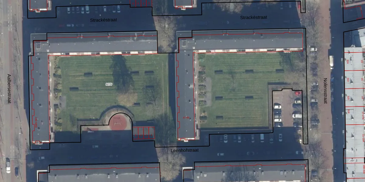 Het perceel waarop Strackéstraat 45 staat heeft een oppervlakte van 8172 m². Dit is een zeer groot perceel. De perceeloppervlakte wordt geregistreerd door het Kadaster. Gedetailleerde informatie over de maten van dit perceel kunt u vinden in het rapport Kadastrale kaart met maatvoering van Strackéstraat 45.
