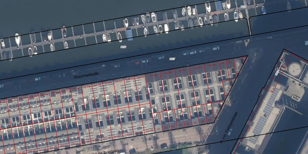 Het perceel waarop Stuurmankade 224 staat heeft een oppervlakte van 7314 m². Dit is een zeer groot perceel. De perceeloppervlakte wordt geregistreerd door het Kadaster. Gedetailleerde informatie over de maten van dit perceel kunt u vinden in het rapport Kadastrale kaart met maatvoering van Stuurmankade 224.