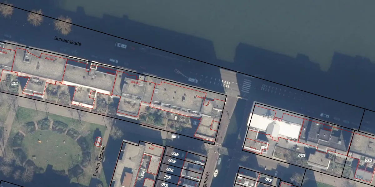 Het perceel waarop Sumatrakade 741 staat heeft een oppervlakte van 4316 m². Dit is een zeer groot perceel. De perceeloppervlakte wordt geregistreerd door het Kadaster. Gedetailleerde informatie over de maten van dit perceel kunt u vinden in het rapport Kadastrale kaart met maatvoering van Sumatrakade 741.