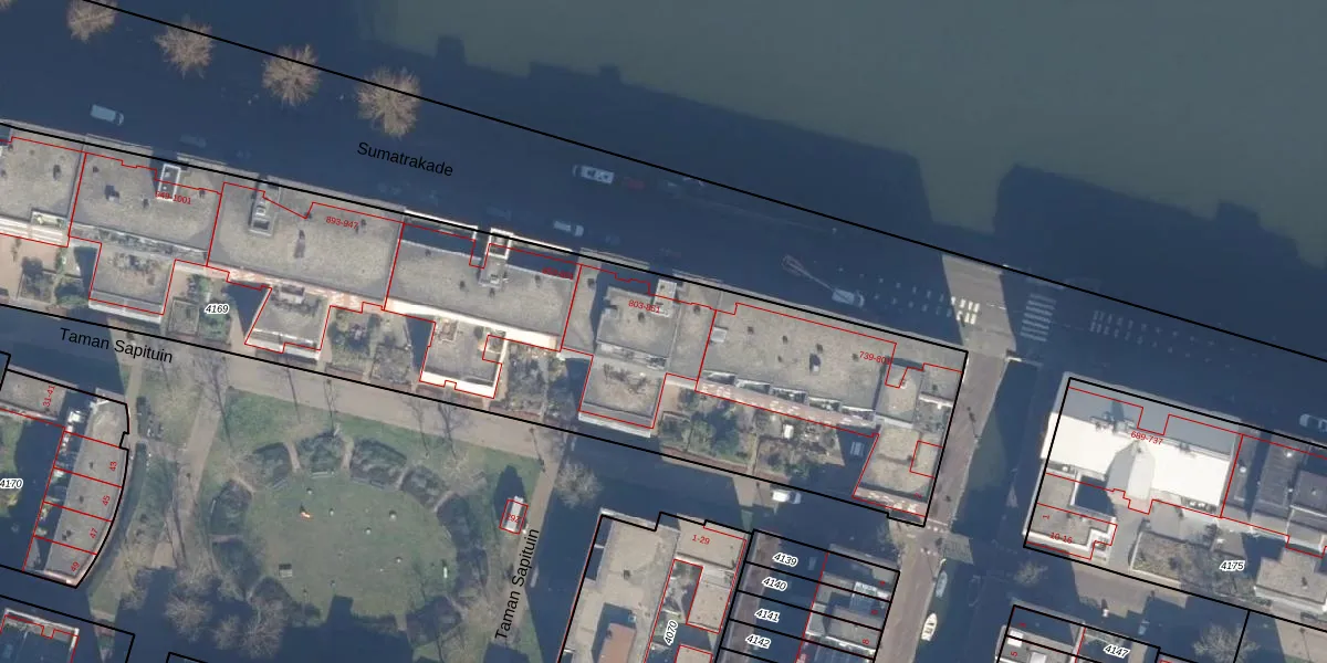 Het perceel waarop Sumatrakade 809 staat heeft een oppervlakte van 4316 m². Dit is een zeer groot perceel. De perceeloppervlakte wordt geregistreerd door het Kadaster. Gedetailleerde informatie over de maten van dit perceel kunt u vinden in het rapport Kadastrale kaart met maatvoering van Sumatrakade 809.