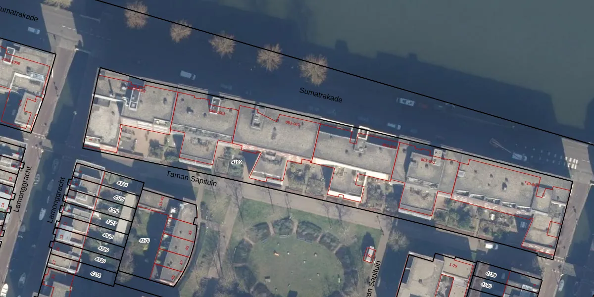 Het perceel waarop Sumatrakade 907 staat heeft een oppervlakte van 4316 m². Dit is een zeer groot perceel. De perceeloppervlakte wordt geregistreerd door het Kadaster. Gedetailleerde informatie over de maten van dit perceel kunt u vinden in het rapport Kadastrale kaart met maatvoering van Sumatrakade 907.