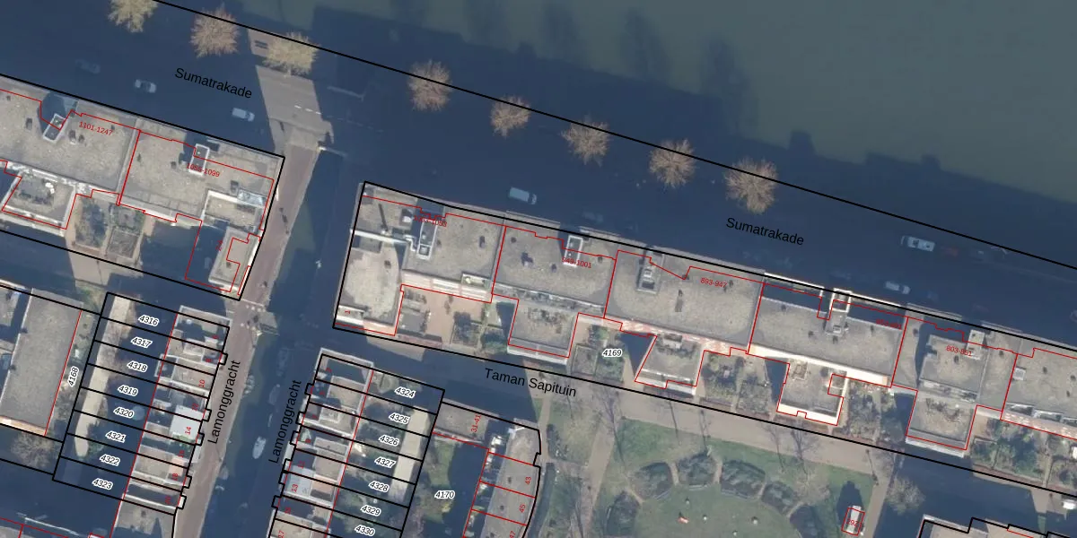 Het perceel waarop Sumatrakade 989 staat heeft een oppervlakte van 4316 m². Dit is een zeer groot perceel. De perceeloppervlakte wordt geregistreerd door het Kadaster. Gedetailleerde informatie over de maten van dit perceel kunt u vinden in het rapport Kadastrale kaart met maatvoering van Sumatrakade 989.