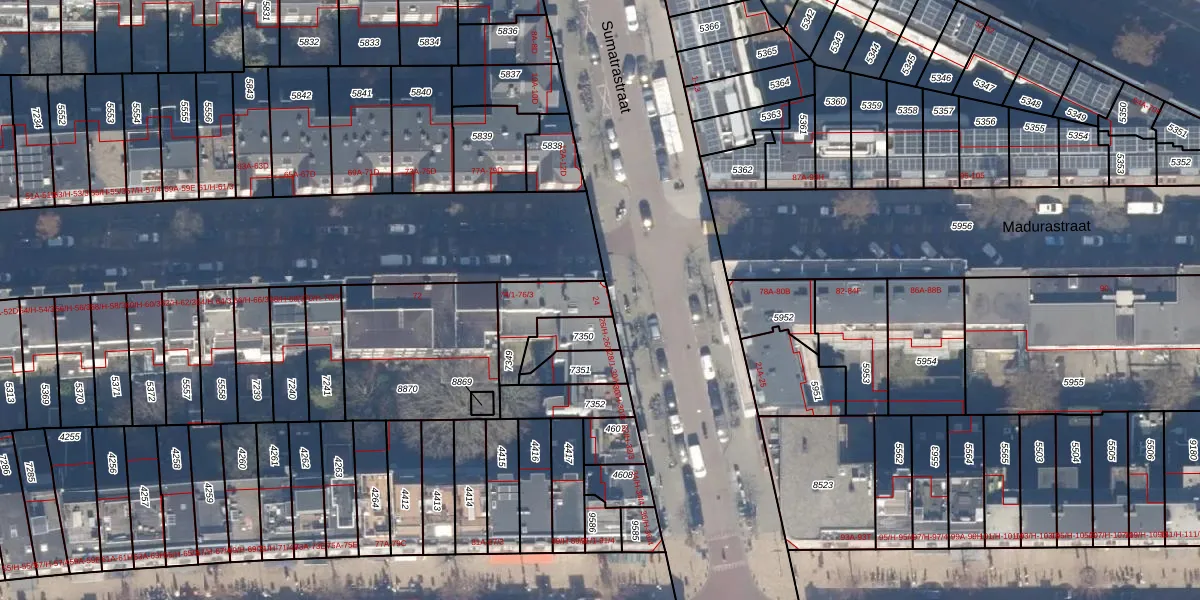 Sumatrastraat 24 is gelegen op kadastraal perceel ASD15S7349. Deze kadastrale aanduiding is uniek en wordt gebruikt door het Kadaster om eigendomsrechten en andere zakelijke rechten vast te leggen. Het perceel maakt onderdeel uit van de kadastrale gemeente Amsterdam.