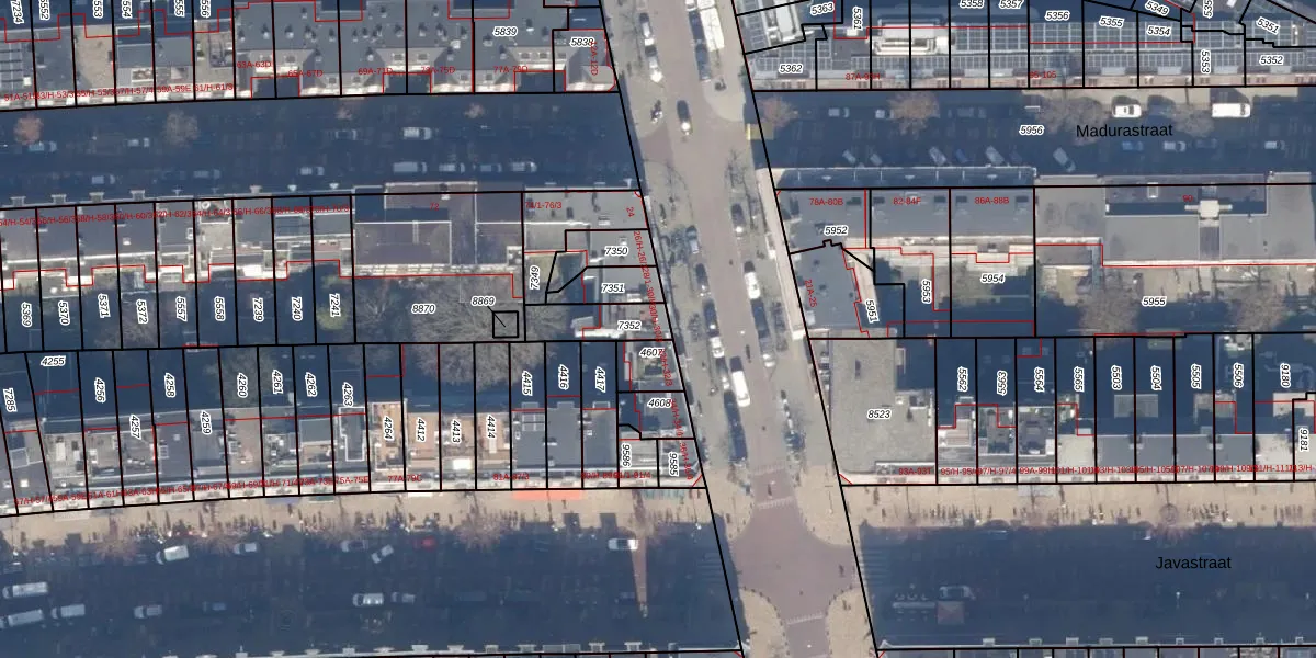 Het perceel waarop het adres ligt is ASD15-S-7352. De afkorting 'ASD15' staat voor kadastrale gemeente Amsterdam. De gemiddelde perceelgrootte in Amsterdam is 537,06 m². Dit perceel is kleiner: de perceeloppervlakte bedraagt 119 m². Het kleinste perceel in de kadastrale gemeente is 0 m² groot. De grootste perceeloppervlakte is 14,5 ha. Op het perceel zijn 5 adressen aanwezig. In de Basisregistratie Kadaster (BRK) werden de grenzen van het perceel geregistreerd op 26-10-2006.