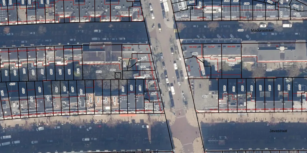 Het perceel waarop het adres ligt is ASD15-S-7352. De afkorting 'ASD15' staat voor kadastrale gemeente Amsterdam. De gemiddelde perceelgrootte in Amsterdam is 537,06 m². Dit perceel is kleiner: de perceeloppervlakte bedraagt 119 m². Het kleinste perceel in de kadastrale gemeente is 0 m² groot. De grootste perceeloppervlakte is 14,5 ha. Op het perceel zijn 5 adressen aanwezig. De laatste wijziging in het de Basisregistratie Kadaster (BRK) was op 26-10-2006.