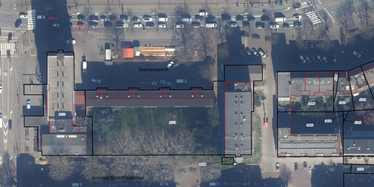 Het perceel waarop Surinameplein 39-2 staat heeft een oppervlakte van 3330 m². Dit is een zeer groot perceel. De perceeloppervlakte wordt geregistreerd door het Kadaster. Gedetailleerde informatie over de maten van dit perceel kunt u vinden in het rapport Kadastrale kaart met maatvoering van Surinameplein 39-2.