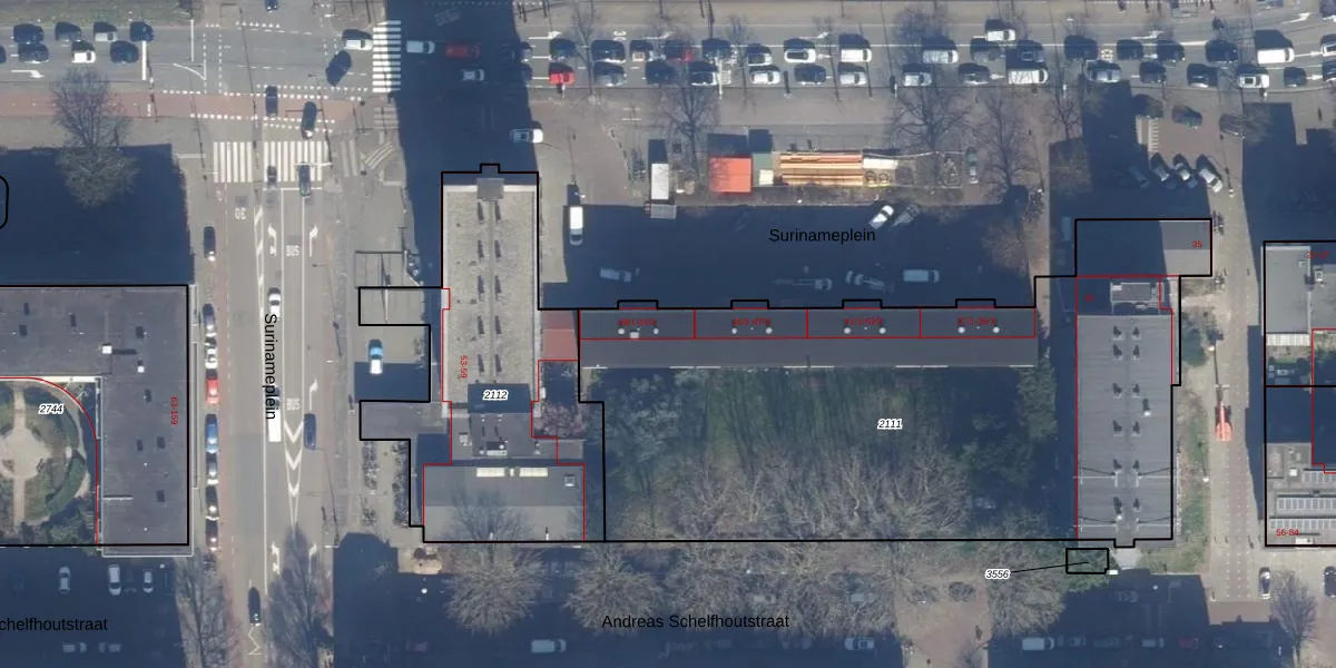 Het perceel waarop Surinameplein 49-2 staat heeft een oppervlakte van 3330 m². Dit is een zeer groot perceel. De perceeloppervlakte wordt geregistreerd door het Kadaster. Gedetailleerde informatie over de maten van dit perceel kunt u vinden in het rapport Kadastrale kaart met maatvoering van Surinameplein 49-2.