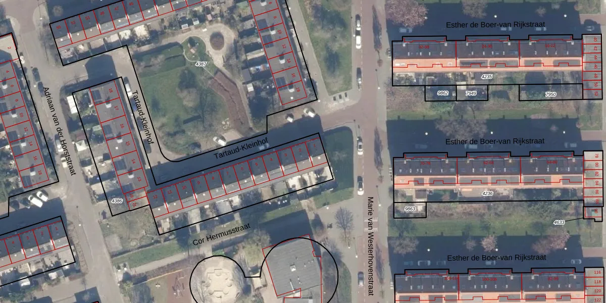 Het perceel waarop Tartaud-Kleinhof 2 staat heeft een oppervlakte van 1676 m². Dit is een zeer groot perceel. De perceeloppervlakte wordt geregistreerd door het Kadaster. Gedetailleerde informatie over de maten van dit perceel kunt u vinden in het rapport Kadastrale kaart met maatvoering van Tartaud-Kleinhof 2.