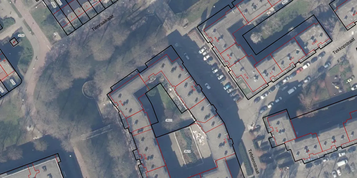 Tefelenstraat 43 is gelegen op kadastraal perceel WPK02L3621. Deze kadastrale aanduiding is uniek en wordt gebruikt door het Kadaster om eigendomsrechten en andere zakelijke rechten vast te leggen. Het perceel maakt onderdeel uit van de kadastrale gemeente Weesperkarspel.