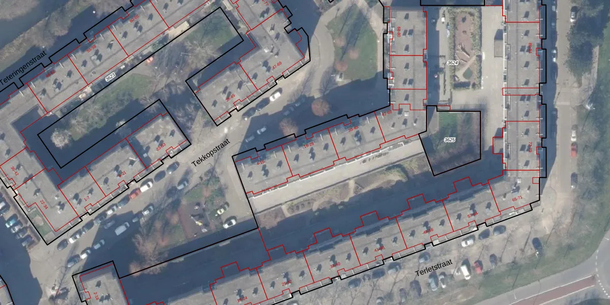 Het perceel waarop Tekkopstraat 20 staat heeft een oppervlakte van 9940 m². Dit is een zeer groot perceel. De perceeloppervlakte wordt geregistreerd door het Kadaster. Gedetailleerde informatie over de maten van dit perceel kunt u vinden in het rapport Kadastrale kaart met maatvoering van Tekkopstraat 20.