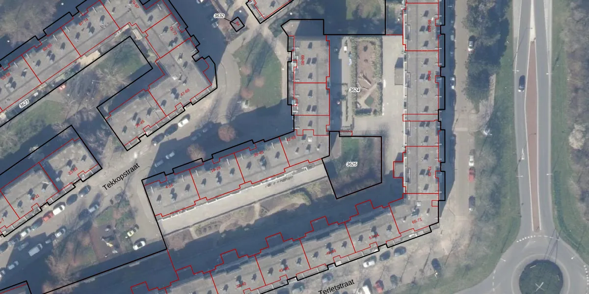 Het perceel waarop Tekkopstraat 42 staat heeft een oppervlakte van 9940 m². Dit is een zeer groot perceel. De perceeloppervlakte wordt geregistreerd door het Kadaster. Gedetailleerde informatie over de maten van dit perceel kunt u vinden in het rapport Kadastrale kaart met maatvoering van Tekkopstraat 42.