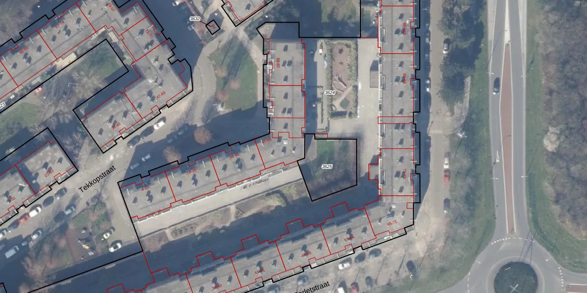 Het perceel waarop Tekkopstraat 48 staat heeft een oppervlakte van 9940 m². Dit is een zeer groot perceel. De perceeloppervlakte wordt geregistreerd door het Kadaster. Gedetailleerde informatie over de maten van dit perceel kunt u vinden in het rapport Kadastrale kaart met maatvoering van Tekkopstraat 48.