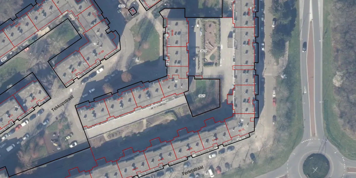 Het perceel waarop Tekkopstraat 52 staat heeft een oppervlakte van 9940 m². Dit is een zeer groot perceel. De perceeloppervlakte wordt geregistreerd door het Kadaster. Gedetailleerde informatie over de maten van dit perceel kunt u vinden in het rapport Kadastrale kaart met maatvoering van Tekkopstraat 52.