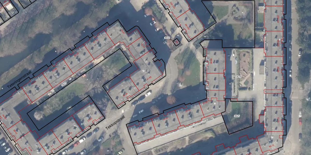 Het perceel waarop Tekkopstraat 55 staat heeft een oppervlakte van 4080 m². Dit is een zeer groot perceel. De perceeloppervlakte wordt geregistreerd door het Kadaster. Gedetailleerde informatie over de maten van dit perceel kunt u vinden in het rapport Kadastrale kaart met maatvoering van Tekkopstraat 55.