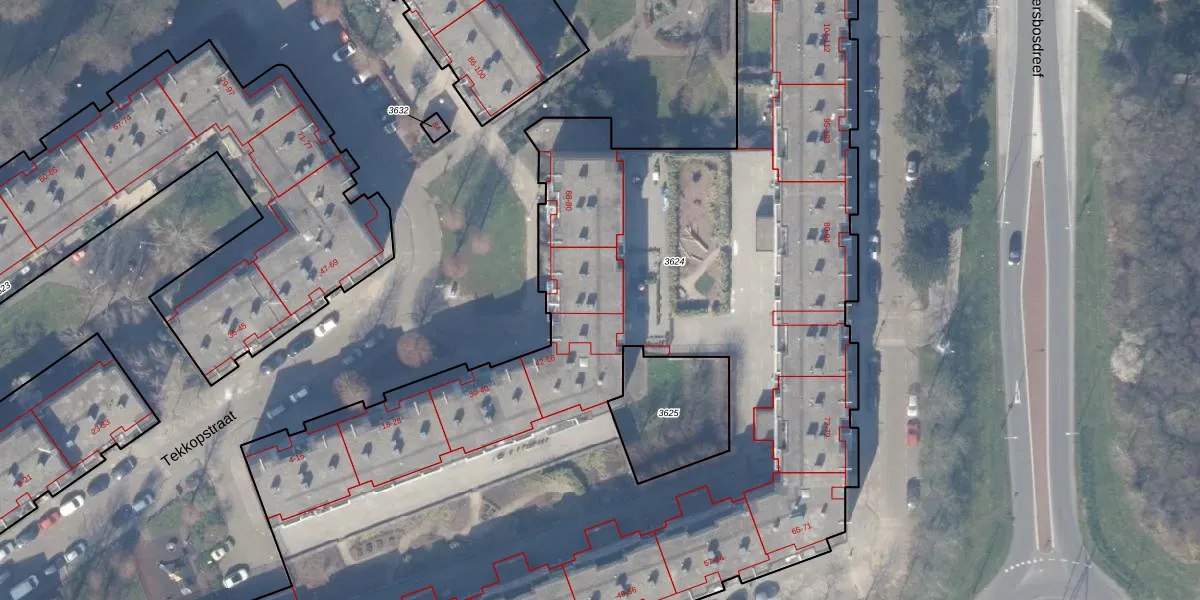 Het perceel waarop Tekkopstraat 56 staat heeft een oppervlakte van 9940 m². Dit is een zeer groot perceel. De perceeloppervlakte wordt geregistreerd door het Kadaster. Gedetailleerde informatie over de maten van dit perceel kunt u vinden in het rapport Kadastrale kaart met maatvoering van Tekkopstraat 56.