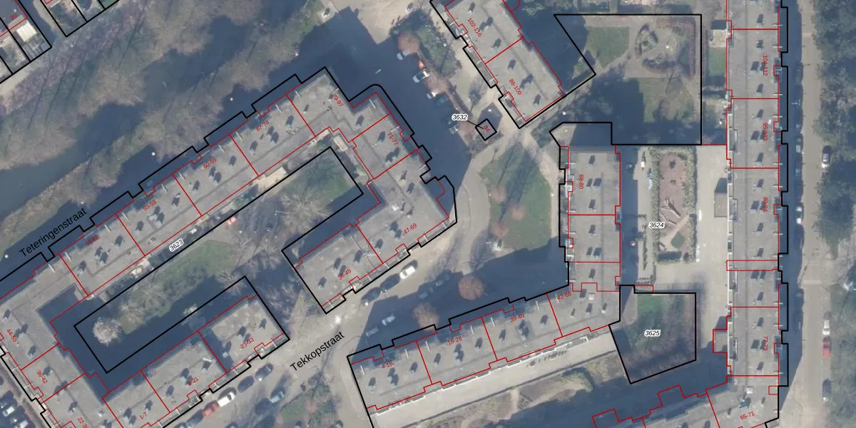 Het perceel waarop Tekkopstraat 63 staat heeft een oppervlakte van 4080 m². Dit is een zeer groot perceel. De perceeloppervlakte wordt geregistreerd door het Kadaster. Gedetailleerde informatie over de maten van dit perceel kunt u vinden in het rapport Kadastrale kaart met maatvoering van Tekkopstraat 63.