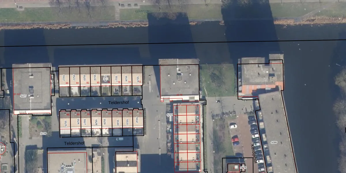 Het perceel waarop Teldershof 63 staat heeft een oppervlakte van 3283 m². Dit is een zeer groot perceel. De perceeloppervlakte wordt geregistreerd door het Kadaster. Gedetailleerde informatie over de maten van dit perceel kunt u vinden in het rapport Kadastrale kaart met maatvoering van Teldershof 63.