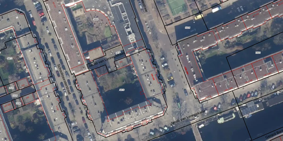 Het perceel waarop het adres ligt is ASD16-T-5879. De afkorting 'ASD16' staat voor kadastrale gemeente Amsterdam. Het perceel is met 2683 m² relatief groot. Het gemiddelde ligt in de kadastrale gemeente Amsterdam op 245,33 m². Het kleinste perceel in de kadastrale gemeente is 0 m² groot. De grootste perceeloppervlakte is 3,3 ha. Er zijn 69 adressen aanwezig op het perceel. De laatste wijziging in het de Basisregistratie Kadaster (BRK) was op 15-08-2008.