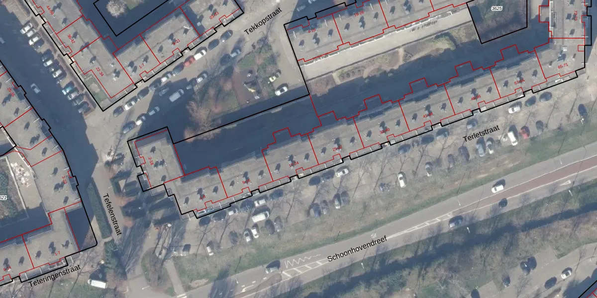 Het perceel waarop Terletstraat 24 staat heeft een oppervlakte van 9940 m². Dit is een zeer groot perceel. De perceeloppervlakte wordt geregistreerd door het Kadaster. Gedetailleerde informatie over de maten van dit perceel kunt u vinden in het rapport Kadastrale kaart met maatvoering van Terletstraat 24.
