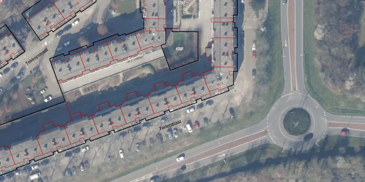 Het perceel waarop Terletstraat 59 staat heeft een oppervlakte van 9940 m². Dit is een zeer groot perceel. De perceeloppervlakte wordt geregistreerd door het Kadaster. Gedetailleerde informatie over de maten van dit perceel kunt u vinden in het rapport Kadastrale kaart met maatvoering van Terletstraat 59.