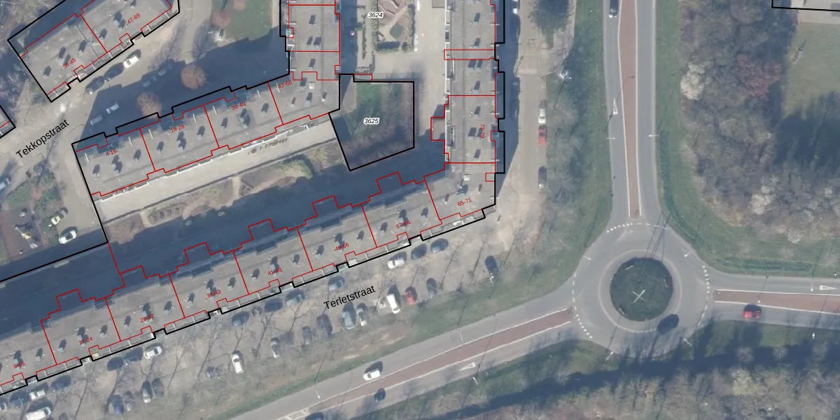 Het perceel waarop Terletstraat 63 staat heeft een oppervlakte van 9940 m². Dit is een zeer groot perceel. De perceeloppervlakte wordt geregistreerd door het Kadaster. Gedetailleerde informatie over de maten van dit perceel kunt u vinden in het rapport Kadastrale kaart met maatvoering van Terletstraat 63.