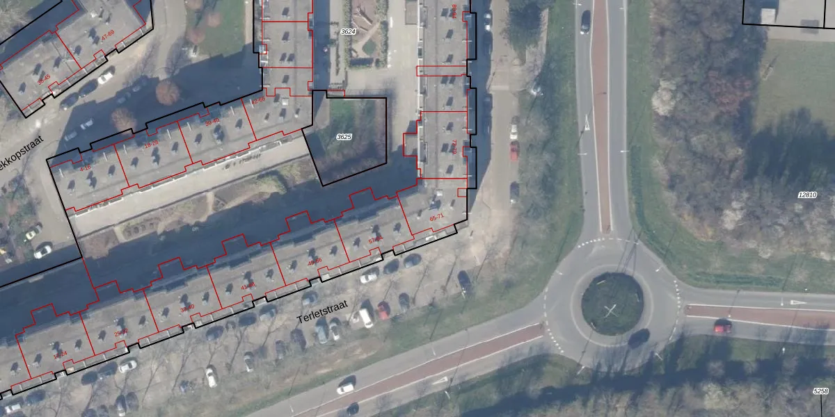 Het perceel waarop Terletstraat 67 staat heeft een oppervlakte van 9940 m². Dit is een zeer groot perceel. De perceeloppervlakte wordt geregistreerd door het Kadaster. Gedetailleerde informatie over de maten van dit perceel kunt u vinden in het rapport Kadastrale kaart met maatvoering van Terletstraat 67.