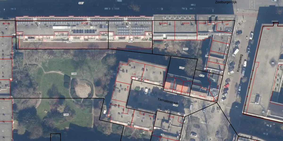 Het perceel waarop Ternatestraat 13 staat heeft een oppervlakte van 4978 m². Dit is een zeer groot perceel. De perceeloppervlakte wordt geregistreerd door het Kadaster. Gedetailleerde informatie over de maten van dit perceel kunt u vinden in het rapport Kadastrale kaart met maatvoering van Ternatestraat 13.