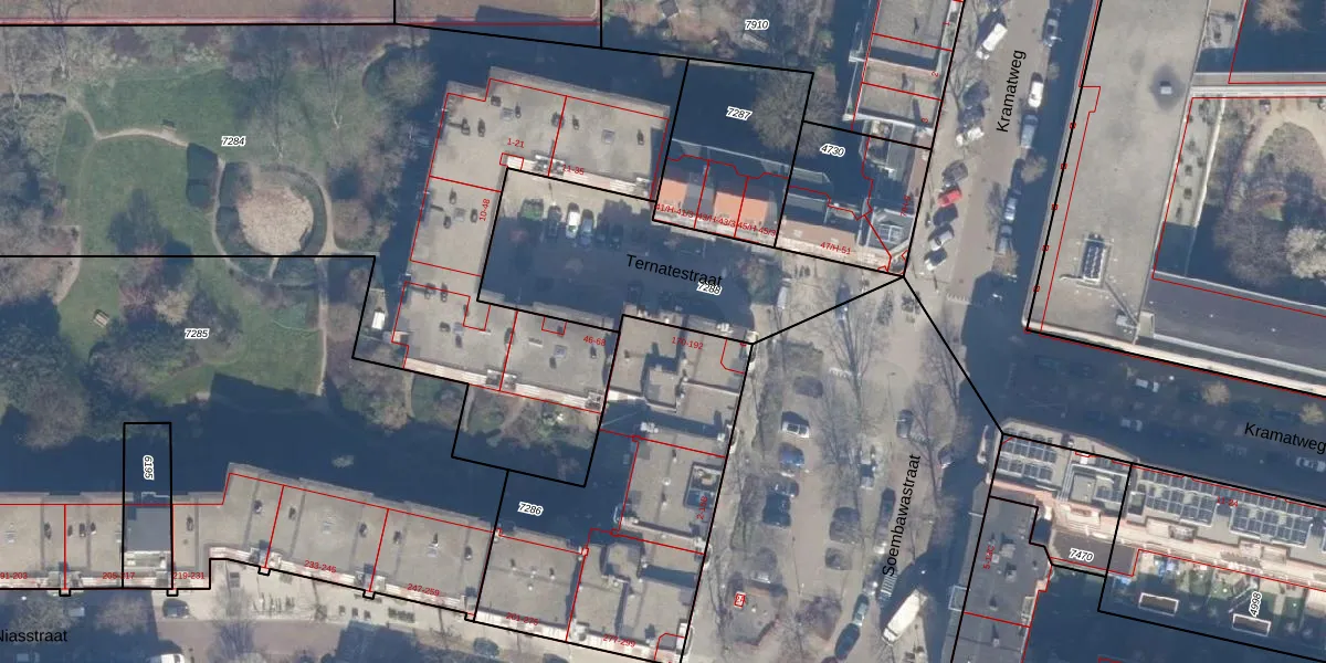 Ternatestraat 174 is gelegen op kadastraal perceel ASD19W7286. Deze kadastrale aanduiding is uniek en wordt gebruikt door het Kadaster om eigendomsrechten en andere zakelijke rechten vast te leggen. Het perceel maakt onderdeel uit van de kadastrale gemeente Amsterdam.