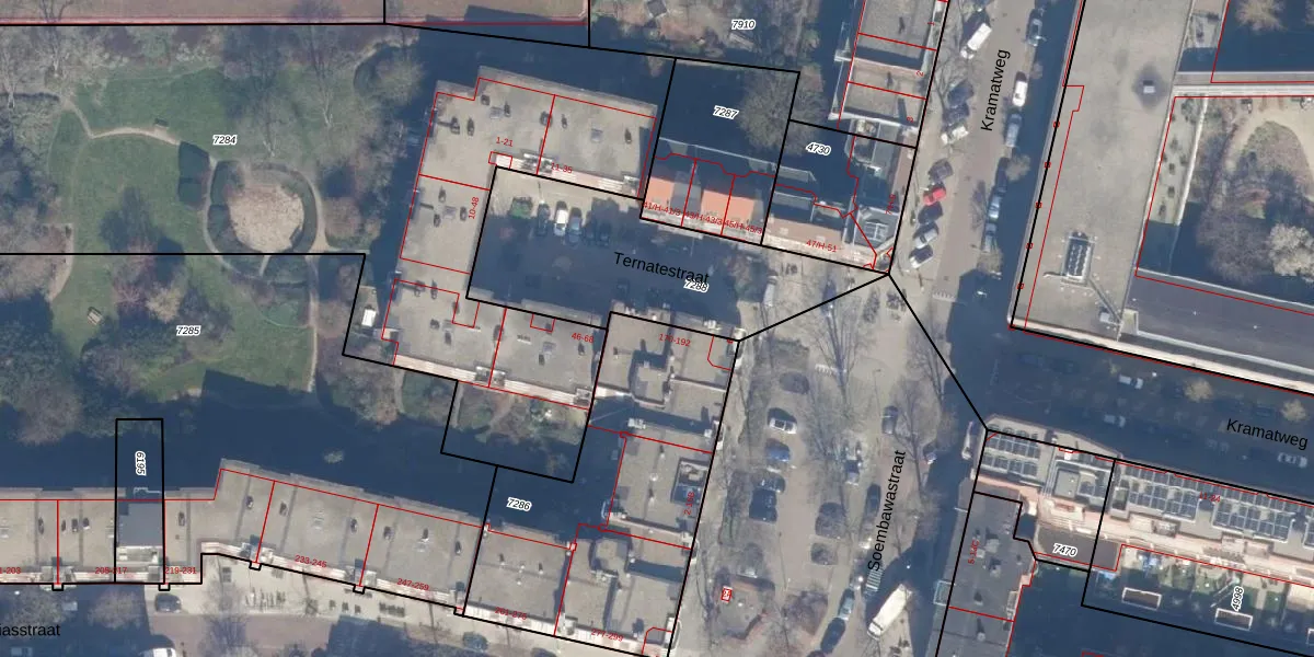 Ternatestraat 176 is gelegen op kadastraal perceel ASD19W7286. Deze kadastrale aanduiding is uniek en wordt gebruikt door het Kadaster om eigendomsrechten en andere zakelijke rechten vast te leggen. Het perceel maakt onderdeel uit van de kadastrale gemeente Amsterdam.