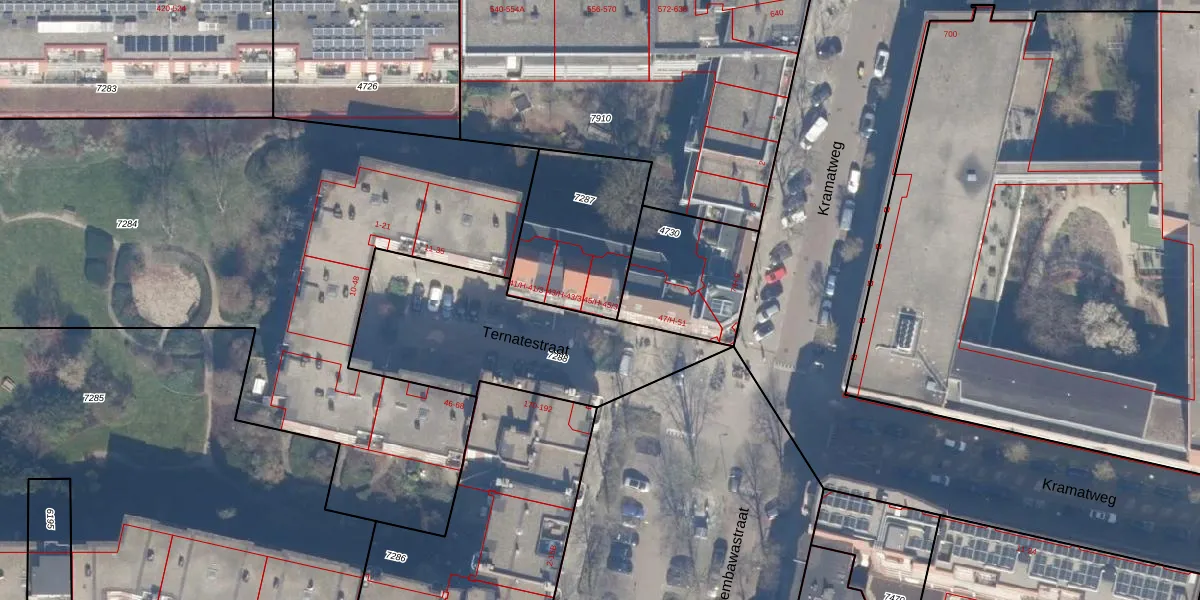 Het perceel waarop Ternatestraat 45-2 staat heeft een oppervlakte van 485 m². Dit is een groot perceel. De perceeloppervlakte wordt geregistreerd door het Kadaster. Gedetailleerde informatie over de maten van dit perceel kunt u vinden in het rapport Kadastrale kaart met maatvoering van Ternatestraat 45-2.