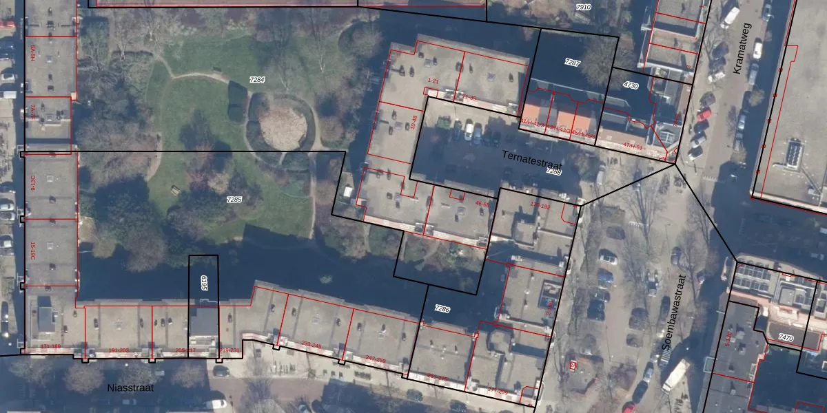 Het perceel waarop Ternatestraat 48 staat heeft een oppervlakte van 4978 m². Dit is een zeer groot perceel. De perceeloppervlakte wordt geregistreerd door het Kadaster. Gedetailleerde informatie over de maten van dit perceel kunt u vinden in het rapport Kadastrale kaart met maatvoering van Ternatestraat 48.