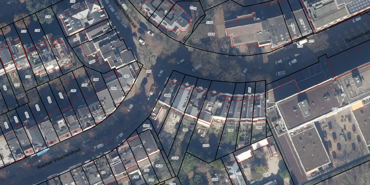 Het perceel waarop Tesselschadestraat 13-A staat heeft een oppervlakte van 340 m². Dit is een groot perceel. De perceeloppervlakte wordt geregistreerd door het Kadaster. Gedetailleerde informatie over de maten van dit perceel kunt u vinden in het rapport Kadastrale kaart met maatvoering van Tesselschadestraat 13-A.