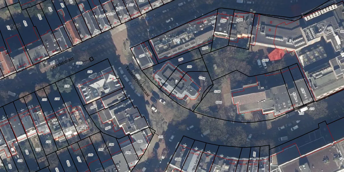 Het perceel waarop Tesselschadestraat 20 staat heeft een oppervlakte van 195 m². Dit is een middelgroot perceel. De perceeloppervlakte wordt geregistreerd door het Kadaster. Gedetailleerde informatie over de maten van dit perceel kunt u vinden in het rapport Kadastrale kaart met maatvoering van Tesselschadestraat 20.