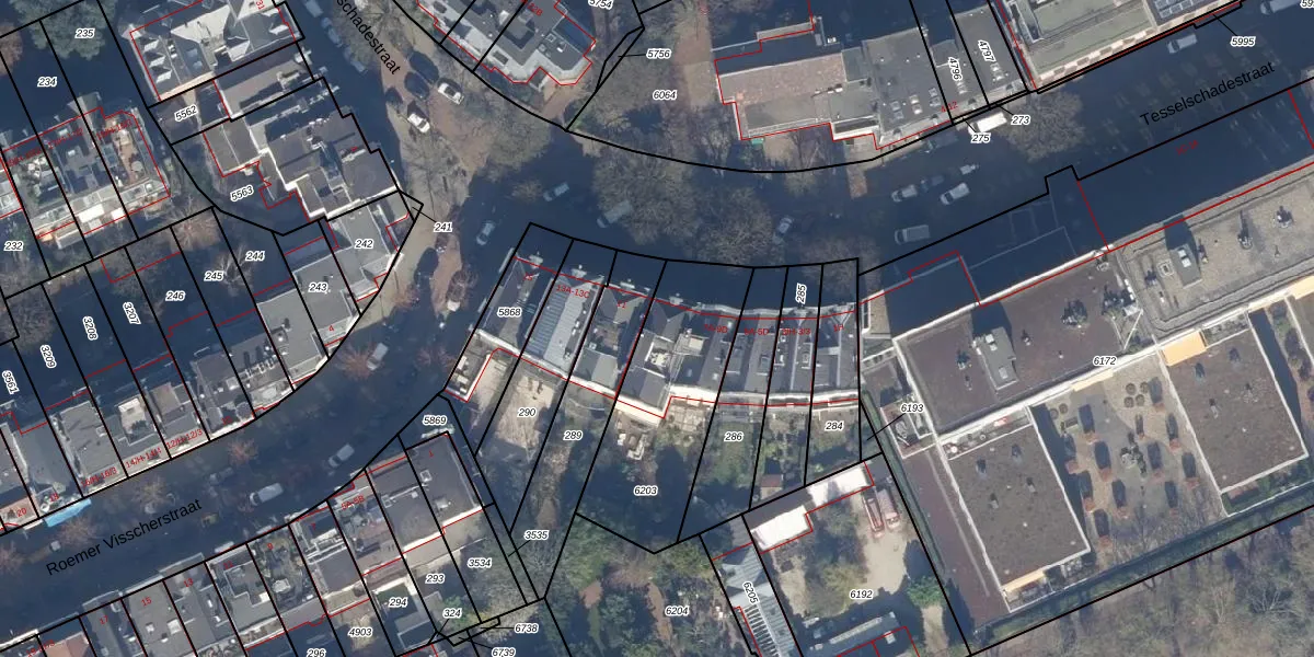 Het perceel waarop Tesselschadestraat 9-C staat heeft een oppervlakte van 647 m². Dit is een groot perceel. De perceeloppervlakte wordt geregistreerd door het Kadaster. Gedetailleerde informatie over de maten van dit perceel kunt u vinden in het rapport Kadastrale kaart met maatvoering van Tesselschadestraat 9-C.