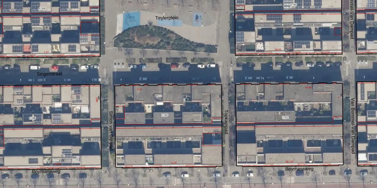 Het perceel waarop Teylerplein 7 staat heeft een oppervlakte van 2490 m². Dit is een zeer groot perceel. De perceeloppervlakte wordt geregistreerd door het Kadaster. Gedetailleerde informatie over de maten van dit perceel kunt u vinden in het rapport Kadastrale kaart met maatvoering van Teylerplein 7.