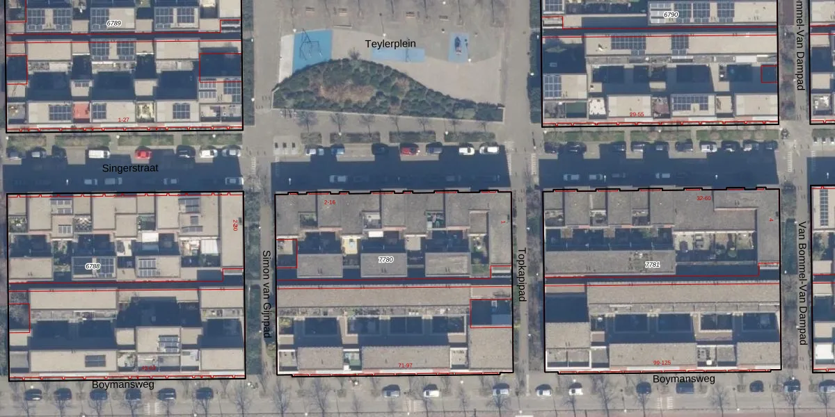 Het perceel waarop Teylerplein 8 staat heeft een oppervlakte van 2490 m². Dit is een zeer groot perceel. De perceeloppervlakte wordt geregistreerd door het Kadaster. Gedetailleerde informatie over de maten van dit perceel kunt u vinden in het rapport Kadastrale kaart met maatvoering van Teylerplein 8.