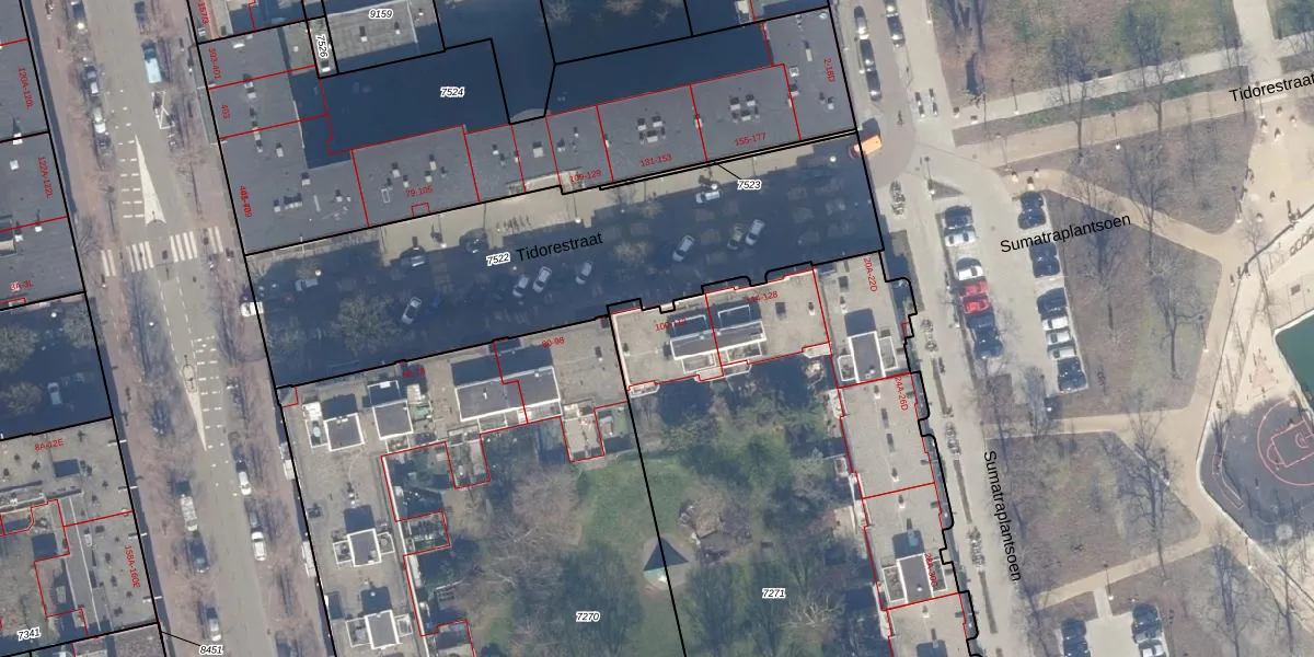 Tidorestraat 102 is gelegen op kadastraal perceel ASD19W7271. Deze kadastrale aanduiding is uniek en wordt gebruikt door het Kadaster om eigendomsrechten en andere zakelijke rechten vast te leggen. Het perceel maakt onderdeel uit van de kadastrale gemeente Amsterdam.