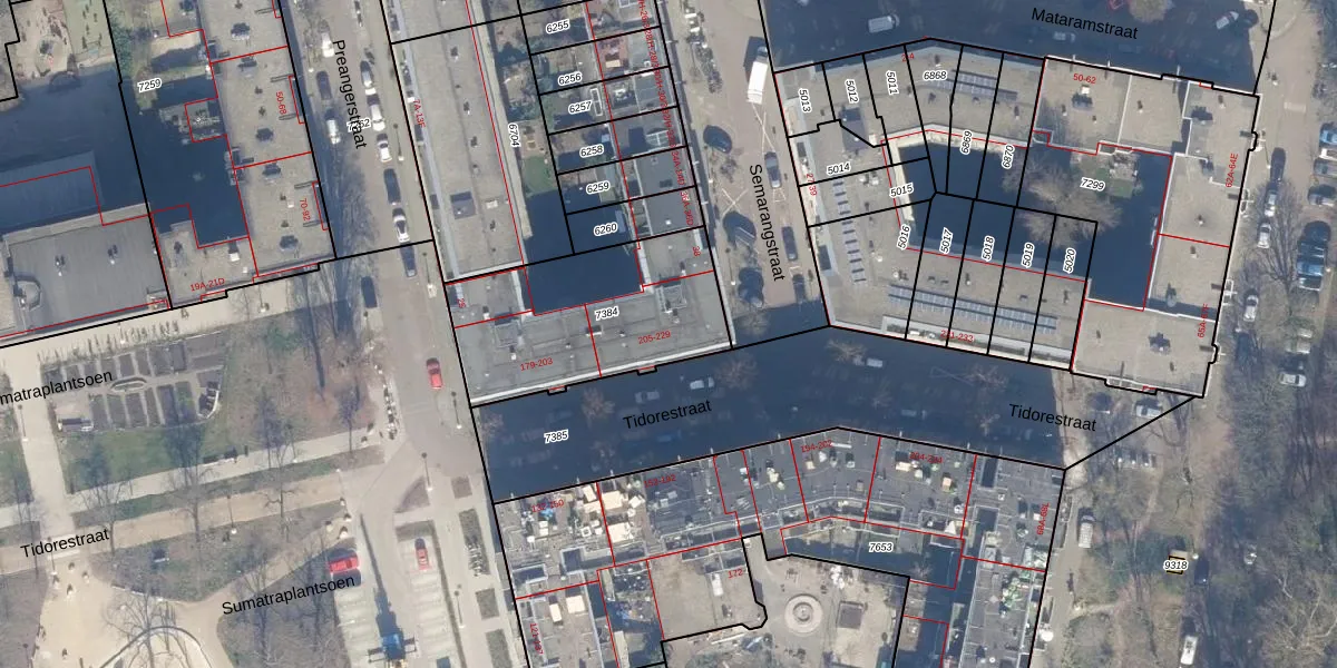 Tidorestraat 213 is gelegen op kadastraal perceel ASD19W7384. Deze kadastrale aanduiding is uniek en wordt gebruikt door het Kadaster om eigendomsrechten en andere zakelijke rechten vast te leggen. Het perceel maakt onderdeel uit van de kadastrale gemeente Amsterdam.