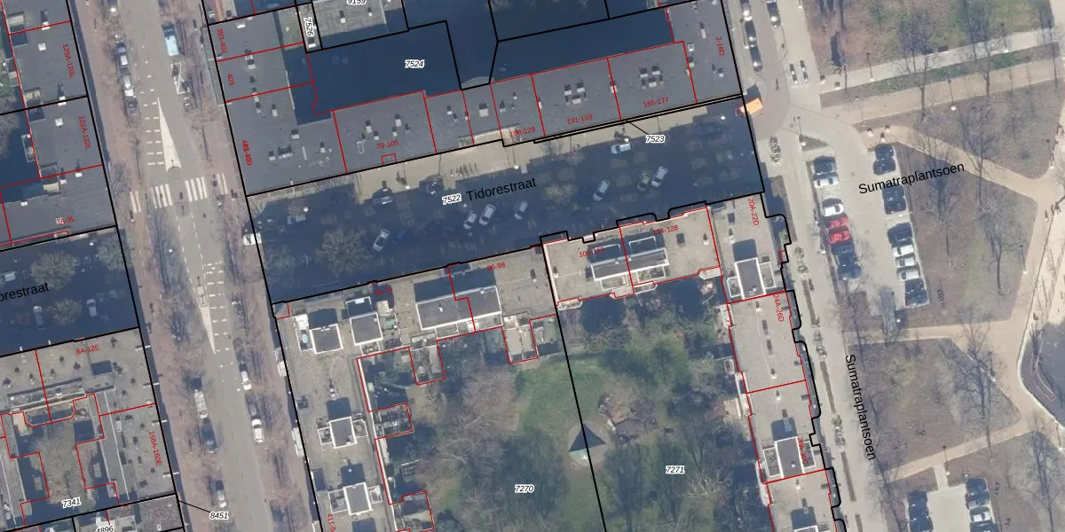 Tidorestraat 96 is gelegen op kadastraal perceel ASD19W7270. Deze kadastrale aanduiding is uniek en wordt gebruikt door het Kadaster om eigendomsrechten en andere zakelijke rechten vast te leggen. Het perceel maakt onderdeel uit van de kadastrale gemeente Amsterdam.