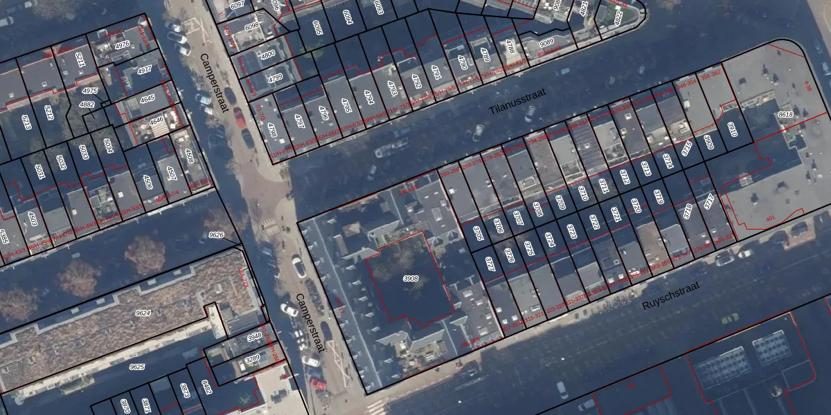 Het perceel waarop het adres ligt is ASD15-S-3908. De afkorting 'ASD15' staat voor kadastrale gemeente Amsterdam. De oppervlakte van het perceel is 1600 m². Dat is groter dan gemiddeld in Amsterdam, waar de gemiddelde perceeloppervlakte op 537,06 m² ligt. Het grootste perceel in de kadastrale gemeente is 14,5 ha. Het kleinste perceel heeft een oppervlakte van 0 m². Op het perceel liggen in totaal 28 adressen. De huidige grenzen van het perceel zijn digitaal in de Basisregistratie Kadaster (BRK) geregistreerd op 22-11-2006.