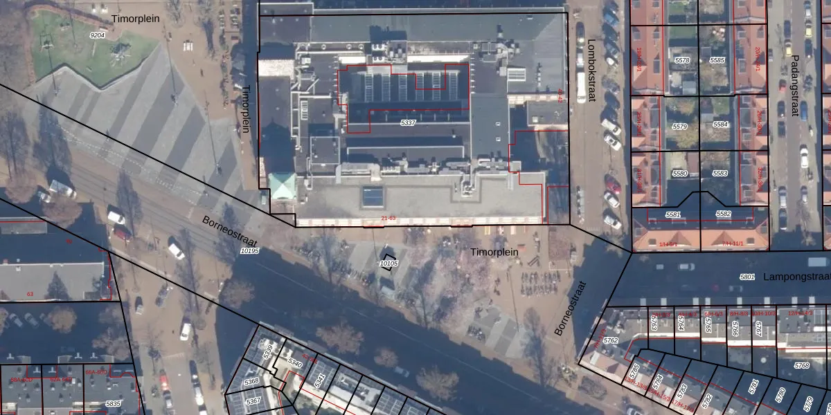 Het perceel waarop Timorplein 44 staat heeft een oppervlakte van 3761 m². Dit is een zeer groot perceel. De perceeloppervlakte wordt geregistreerd door het Kadaster. Gedetailleerde informatie over de maten van dit perceel kunt u vinden in het rapport Kadastrale kaart met maatvoering van Timorplein 44.