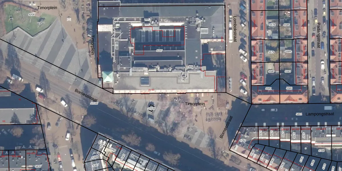 Het perceel waarop Timorplein 49 staat heeft een oppervlakte van 3761 m². Dit is een zeer groot perceel. De perceeloppervlakte wordt geregistreerd door het Kadaster. Gedetailleerde informatie over de maten van dit perceel kunt u vinden in het rapport Kadastrale kaart met maatvoering van Timorplein 49.
