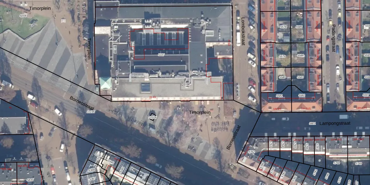 Timorplein 56 is gelegen op kadastraal perceel ASD15S5337. Deze kadastrale aanduiding is uniek en wordt gebruikt door het Kadaster om eigendomsrechten en andere zakelijke rechten vast te leggen. Het perceel maakt onderdeel uit van de kadastrale gemeente Amsterdam.