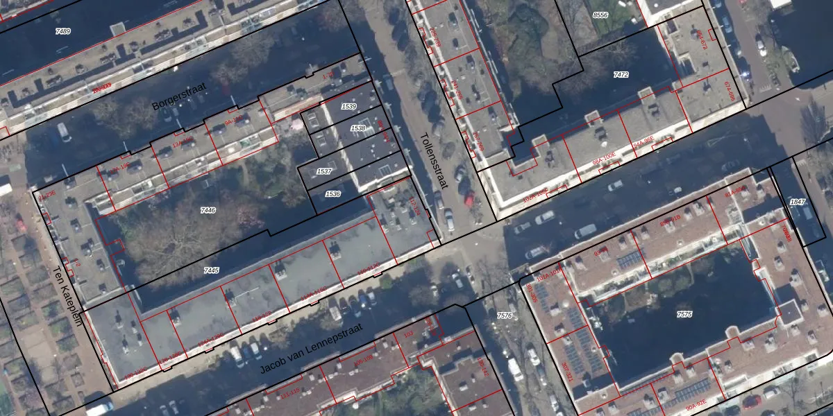 Tollensstraat 116 is gelegen op kadastraal perceel ASD13Q7445. Deze kadastrale aanduiding is uniek en wordt gebruikt door het Kadaster om eigendomsrechten en andere zakelijke rechten vast te leggen. Het perceel maakt onderdeel uit van de kadastrale gemeente Amsterdam.