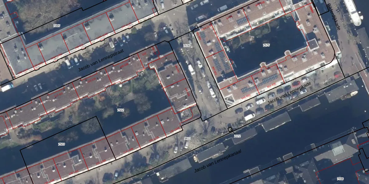 Het perceel waarop het adres ligt is ASD13-Q-7502. De afkorting 'ASD13' staat voor kadastrale gemeente Amsterdam. De oppervlakte van het perceel is 4948 m². Dat is groter dan gemiddeld in Amsterdam, waar de gemiddelde perceeloppervlakte op 393,94 m² ligt. De grootste perceeloppervlakte in de kadastrale gemeente is 6,2 ha. De kleinste oppervlakte bedraagt 1 m². Op het perceel zijn 88 adressen aanwezig. In de Basisregistratie Kadaster (BRK) werden de grenzen van het perceel geregistreerd op 15-08-2008.