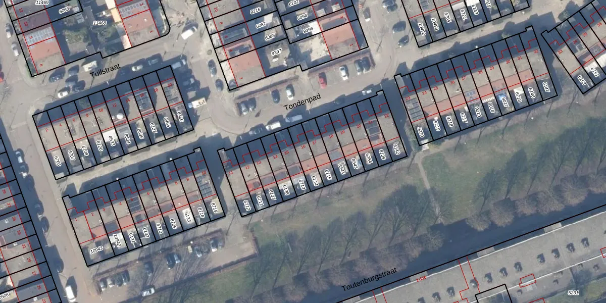 Het perceel waarop Tondenpad 16 staat heeft een oppervlakte van 108 m². Dit is een middelgroot perceel. De perceeloppervlakte wordt geregistreerd door het Kadaster. Gedetailleerde informatie over de maten van dit perceel kunt u vinden in het rapport Kadastrale kaart met maatvoering van Tondenpad 16.