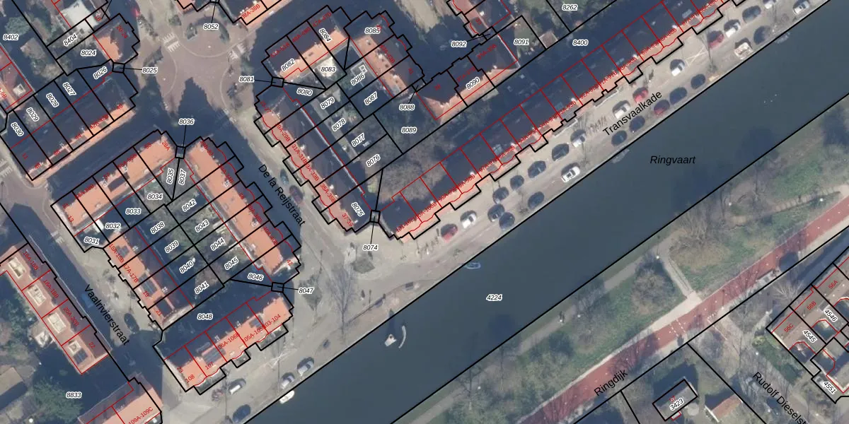 Transvaalkade 100-B is gelegen op kadastraal perceel ASD19W8400. Deze kadastrale aanduiding is uniek en wordt gebruikt door het Kadaster om eigendomsrechten en andere zakelijke rechten vast te leggen. Het perceel maakt onderdeel uit van de kadastrale gemeente Amsterdam.