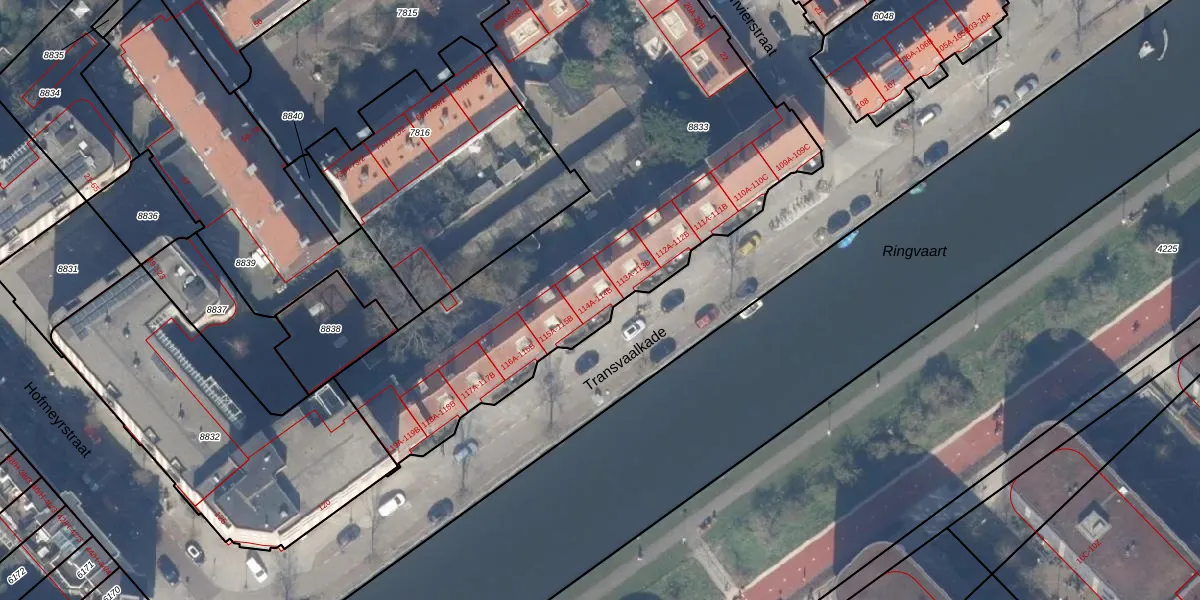Transvaalkade 114-A is gelegen op kadastraal perceel ASD19W8833. Deze kadastrale aanduiding is uniek en wordt gebruikt door het Kadaster om eigendomsrechten en andere zakelijke rechten vast te leggen. Het perceel maakt onderdeel uit van de kadastrale gemeente Amsterdam.