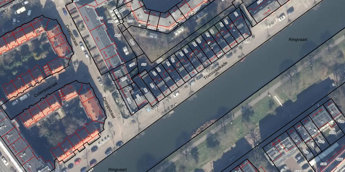 Het perceel waarop Transvaalkade 72 staat heeft een oppervlakte van 82 m². Dit is een klein perceel. De perceeloppervlakte wordt geregistreerd door het Kadaster. Gedetailleerde informatie over de maten van dit perceel kunt u vinden in het rapport Kadastrale kaart met maatvoering van Transvaalkade 72.